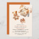 Cute autumn baby shower invitations with watercolor illustrations of a teddy bear and cosy baby clothes. Off-white ivory colour with a bright burnt orange. Gender neutral design is perfect for a baby boy or a baby girl.