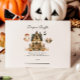 This neutral Halloween baby shower design brings spooky charm with soft fall tones and whimsical woodland details. A cosy haunted cottage is surrounded by cute ghosts, pumpkins, and bats — perfect for a gender-neutral, cottagecore-inspired fall baby celebration.