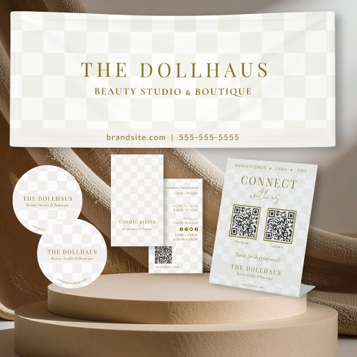 The elegant chequered business name hang tag features a neutral tan chequered background with gold elegant text. Add your business name and tagline to the front of the featuring a sleek background with elegant serif font. Your business website is displayed at the bottom. Perfect for personal brands, boutiques and more!