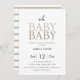 Charming and chic twin baby shower invitation showcases sophisticated neutral beige lettering that reads "Oh Baby Baby" against a pristine white backdrop. The reverse side features a delightful pastel beige and white stripe pattern. This invitation is designed for effortless personalisation, making it the ideal choice for commemorating the impending arrival of twin babies in a tasteful and stylish manner.