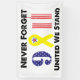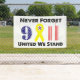 “9 11” in Stars and Strips with the shape of the Twin Towers in New York City, a yellow ribbon, and “Never Forget” “United We Stand” to honour and remember the victims and heroes of September 11, 2001.