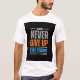 The t-shirt design features a bold motivational message set against a black background. The text is arranged in a stacked, eye-catching format with each phrase in a different colour and font style. At the top, "ALWAYS" is written in white, uppercase letters and framed by two horizontal white lines. Below, the phrase "NEVER GIVE UP" stands out in large, distressed grey and orange lettering, with "NEVER" in grey and "GIVE UP" in vibrant orange. The final line, "STAY STRONG," is in uppercase blue letters, also framed by white horizontal lines. The combination of strong, contrasting colours and distressed fonts conveys resilience and determination.