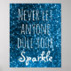 Inspirational print quote poster features a midnight blue glitter look background and reads 'Never Let Anyone Dull Your Sparkle' in white whimsical, trendy letters. Perfect inspirational gift for teen girls, and girly blue glitter decor for a teenager. Cute, inspirational graduation gift for her, too.