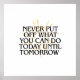 This powerful and timeless motivational quote, "Never put off what you can do today until tomorrow", is the perfect daily reminder to take action and stay focused. Whether you're buying this design on a t-shirt, notebook, mug, or phone case, it brings a spark of productivity and inspiration to your everyday life. Ideal for students, entrepreneurs, planners, and anyone who loves motivational art. Great gift idea for go-getters and dream chasers!motivational quote