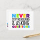 Bright multi colour text design reads "Never Stop Wondering and Asking Questions" on inspirational message T-shirts, magnets, buttons, tote bags, cards, stickers, key chains, mousepads, water bottles, and much more. These motivational message items are great for teachers and other educational professionals!