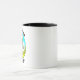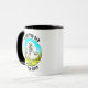 Blue and green coffee mug with a vintage retro vibe featuring a skeleton in a sunhat disc golfing in the woods with the quote, 'Never too old to disc golf."
