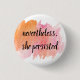 "Nevertheless, she persisted" over a wash of orange and pink watercolors.