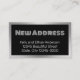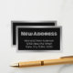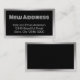 This black and silver change of address insert can be personalised with your desired text. At the top, there's large display text (shown: New Address). Then there are three lines of display text for your name and address. The text is white. The silver look border is not made of foil.
