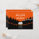 Trendy change of address announcement card featuring a cosy little cabin in the woods with windows and a retro style forest with pine trees and snow.
