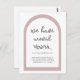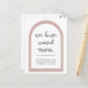 Simple and chic moving announcement with "we have moved" modern script, a pretty grey watercolor botanical branch, trendy pink arch, and new address information.