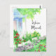 A moving announcement postcard decorated with a quiet cottage with a cobblestone walkway and colourful flowers in bloom hand drawn with ink and watercolor. Nice for letting family, friends, and customers know your new address.