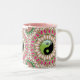 Pretty colours geometric mandala in pinks and green with green and black Yin Yang symbol of balance in each flower centre.