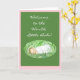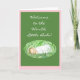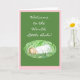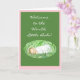A 'Welcome' card for a new baby girl, with a sleeping baby and white lettering on a dark green background, edged with blue.