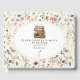 This sweet floral guestbook is for a baby shower event, with the theme 'New chapter'. With the text - "A new chapter is about to be told". The cover of the book features illustrations of a watercolor stack of floral decorated books and the background is spring wildflowers in soft colours. Classic old english text style font for a feeling of old kids illustration books.