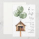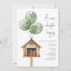 "A new chapter" baby shower theme featuring illustration of a mini neighbourhood lending library with green balloons and a white background.