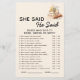 Bring smiles and sweet surprises to your bridal shower with this He Said, She Said – New Chapter Book Edition. Designed to match a literary or “New Chapter Begins” bridal shower theme, this charming game features fun questions and playful quotes where guests guess whether the bride or groom said it. With elegant book-inspired graphics and customisable text, it’s a perfect icebreaker for book-loving brides and romantic storytellers. Ideal for bridal showers, engagement parties, or rehearsal dinners, this printable game adds a thoughtful, lighthearted touch to your celebration.