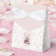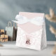 These sweet floral favour box is for a baby shower event, with the theme 'New chapter'. Features illustrations of a watercolor stack of floral decorated books and the background is light blush pink peonies in a soft colour. Classic old english text style font for a feeling of old kids illustration books.