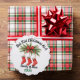 This design features a lovely watercolor illustration of festive pine boughs, red berries, and a classic red bow, from which hang three personalised red stockings.