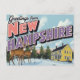 Discover the charm of the Granite State with this nostalgic "Greetings from New Hampshire" postcard. This vintage large-letter design features a serene winter scene with majestic deer (bucks), pine trees, and a classic New England yellow farmhouse. It perfectly captures the rustic beauty and wildlife of New Hampshire. Ideal for residents, visitors, winter sports fans, animal lovers, souvenir collectors, and anyone who enjoys US state travel art and classic Americana. Send a unique note or display this piece of retro nostalgia.
