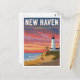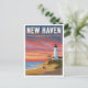 A romantic, vintage-style travel poster featuring a dramatic sunset over the New Haven coastline, with a prominent lighthouse (likely Five Mile Point) on a grassy bluff. The scene captures the picturesque maritime beauty of New Haven, Connecticut. Perfect for residents, Yale alumni, and collectors of retro coastal travel art.