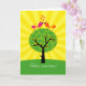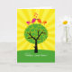 Two birds, sitting on a tree, K-I-S-S-I-N-G! Colourful stylised birds on top of a tree with heart leaves and yellow sun rays radiating out. A cheerful congratulations card for any couple starting out in a new home.