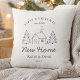 A cosy square throw pillow featuring a clean line-art cottage with pines and snowfall beneath the arch “First Christmas in our New Home.” Neutral black-on-ivory artwork blends with modern or farmhouse spaces. Add names and year to create an inviting accent for sofa, entry bench, or guest room—also a thoughtful housewarming gift for new homeowners.