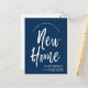 A minimal solid Navy Blue and white script-style moving announcement postcard. It features a large script text of the words "New Home" followed by your address information below it. Most individual elements of the invite card are unlocked so feel free to change or add any details necessary by using the customisation function. You can even add a photo to the reverse side and add a black and white filter to it if you please instead of a message.