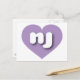 This postcard features a shapely and vibrant lavender heart containing the bold, white, rounded lower case letters nj, a playful abbreviation for New Jersey, the garden state. The reverse side of the postcard is blank awaiting your handwritten sentiments or customised text.