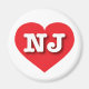 This magnet features a vibrant red heart containing the bold, white, upper case letters NJ, the official abbreviation for New Jersey, the Garden State.