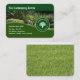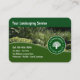 Landscaping business card template in a powerful design with landscaped shrubs, grass, and unique landscaping professional medallion all of which you can customise online. Designed for a landscaper, tree trimmer, lawn service and presented on our large format business card stock taller than standard size for visual impact.