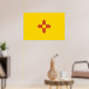 This design features the flag of the state of New Mexico, which is in the Southwestern region of the United States. The flag consists a stylised red sun, a symbol used by the indigenous Zia people, on a field of yellow. It was officially introduced in 1925, having been designed in 1920 to celebrate the state's Native American Pueblo and Nuevo México Hispanic roots. The colours evoke the flags of Habsburg Spain (the Cross of Burgundy) and the Crown of Aragon, brought by the conquistadors. The capital city of New Mexico is Santa Fe. Other major cities in New Mexico include Las Cruces, Rio Rancho, Roswell, Farmington, Clovis, Hobbs, Alamogordo and Carlsbad.