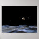 This illustration shows the Pluto system from the surface of one of its new moons. The other members of the Pluto system are just above the putative moon's surface. Pluto is the large disc at centre, right. Charon, the system's only confirmed moon, is the smaller disc to the right of Pluto. The other candidate moon is the bright dot on Pluto's far left.