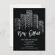 Modern city new office moving announcement postcard featuring city buildings with white lights set on a black background.
