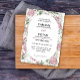 Design features an elegant watercolor floral wreath decorated with peonies, roses and more in shades of pink, red, green and ivory. A matching floral arrangement is added to the back to carry over the overall theme. -6ADesign