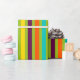 This bright wrapping paper features bold stripes in shades of green, purple, orange, blue and yellow from our New Retro colour palette.