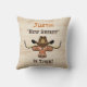 Personalise this Little Cowboy's "One of a Kind" New Sheriff In Town Throw Pillow. It Features a Comical Longhorn Steer Wearing a Brown Sheriff's Western Cowboy Hat with a Big Gold Sheriff's Star, Surrounded by the Words...."New Sheriff In Town" on a Wood Background!
