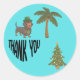 A fun and quirky design featuring a dachshund dressed in traditional Bavarian attire, complete with a green hat, feather, bow tie, and lederhosen. To the right of the dog is a simple palm tree illustration, and below it on the right is a decorated Christmas tree with lights, garlands, and a star on top. At the bottom left, the phrase “THANK YOU” appears in large, stretched black text. The background is a bright turquoise color, giving the design a cheerful and lively feel.