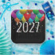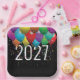 Colourful party balloons and star confetti on black for a 2027 New Year's party.