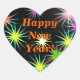 Bright New Years heart-shape sticker with bright star blasts on a black background. The text "Happy New Year!" is customisable.