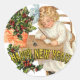 A little girl writes a letter using a dip pen. An arrangement of holly stands on the table nearby. The text says HAPPY NEW YEAR!
