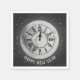 Midnight clock on a full moon with stars on dark grey background for New Years party.
