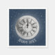 Midnight clock on a full moon with stars on dark blue sky background for New Year's party.