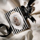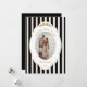 This Happy New Year card showcases a striking black and white striped pattern accented by a modern baroque frame, a simple bow, and an oval photo. The combination of a sleek modern font and a graceful script adds a touch of sophistication, giving the card a stylish, statement-making look. Easily customize it by clicking "Personalize this design".