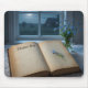 An open vintage journal turned to chapter one, rests on a lace-covered table, with a forget-me-not flower as moonlight streams in and casts a glow on the peaceful night landscape outside