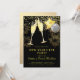 A modern New Year's eve invitation featuring champagne glasses, balloons, and glitter with bursts of fireworks on a black background. Platinum faux gold foil on the back of the invitation.