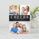 This flat new years greeting card offers three photos on the front. The message is bold "CHEERS to the new year" and appears in white and gold on a black background.