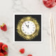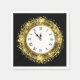 Design features bright, sparkly gold confetti in the round and a clock in Roman numerals. White face/black hands.