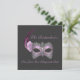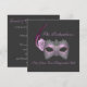 This design features a beautiful lace and feathered mask in shades of grey, soft lilac, and bold purple on a rich grey background. Customise with your personal information to suit your needs. You may wish to chance the title of the event to suit for Mardi Gras, birthdays, and more.