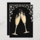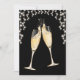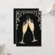 A modern New Year's eve invitation featuring toasting champagne glasses, and string lights on a black background.