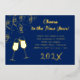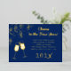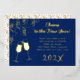Foil New Year’s Eve party invitation with festive confetti falling and clinking glasses design. Dark blue, horizontal template cards, with “Cheers to the new year” text at the top and year numbers along the bottom. In the middle, customise text with party information. All wording, numbers and design elements on the front are foil, in either gold, silver or rose gold. The reverse contains a confetti pattern.